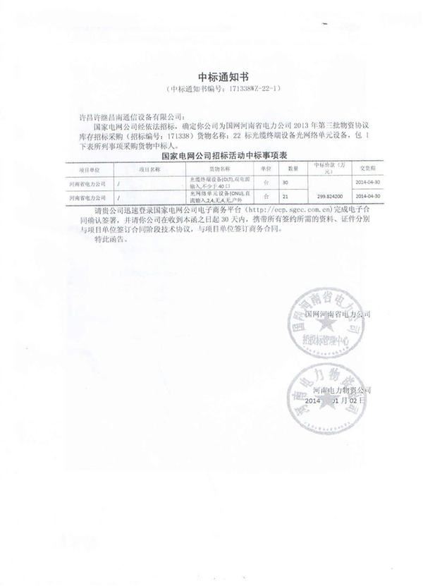 中標河南省電力公司2013年第三批物質協(xié)議庫存招標采購